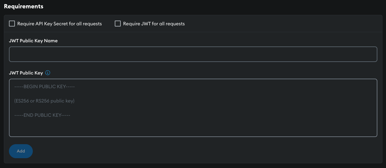 Input the JWT Public key name and the key and select Add.